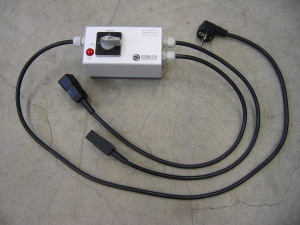 Externe Handumgehung bis 3kVA, 1-phasig, im Einzelgehäuse. Anschlussfertig mit konfektionierten Leitungen und Kaltgerätesteckdosen als Lastabgänge.